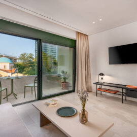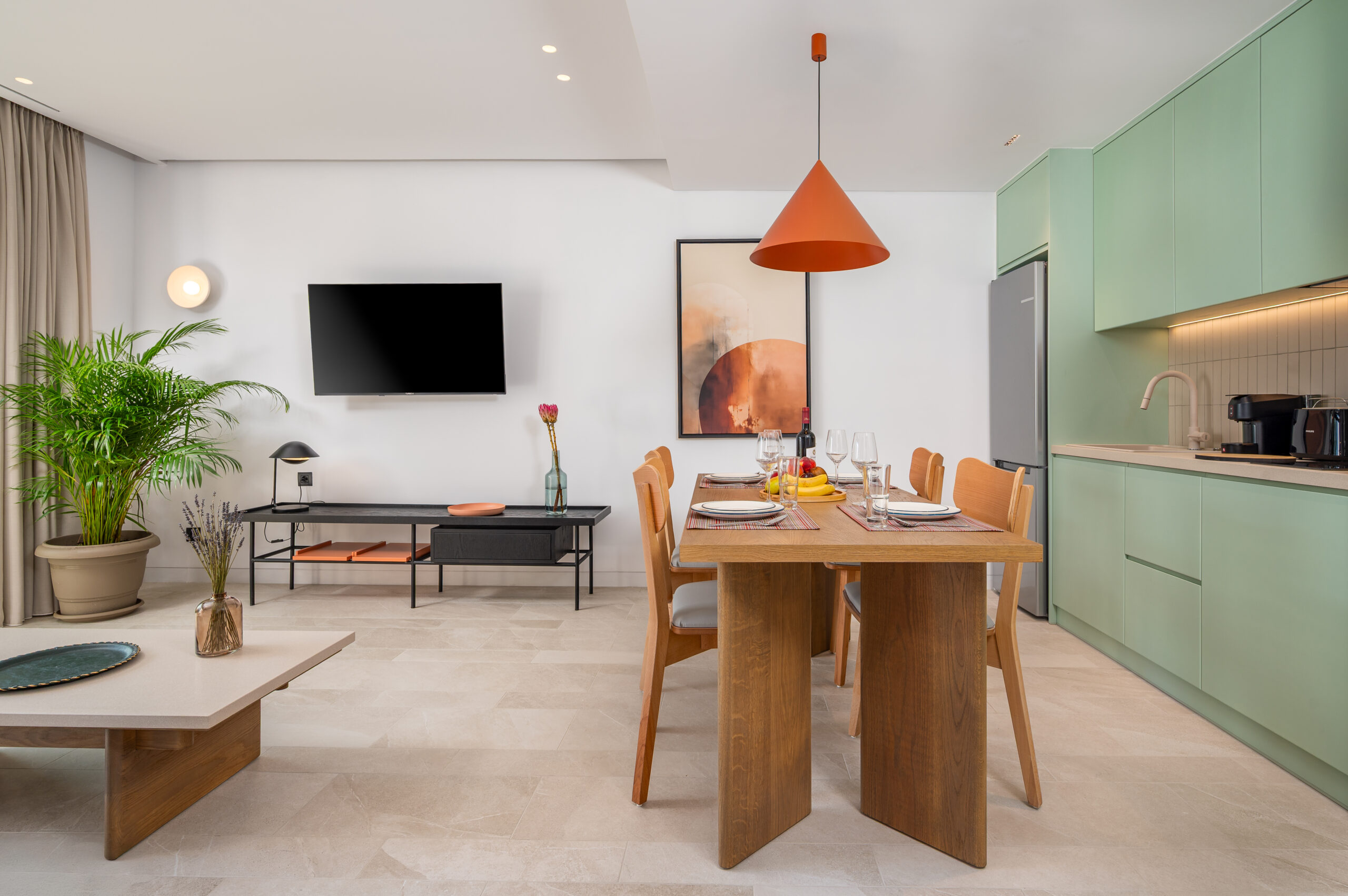 Bright and airy, featuring a king-size bed and lounge with sofa bed, private balcony or terrace, dining space, and fully equipped kitchenette. Enjoy 50” smart TVs, dimmable lighting, keyless access, and sleek modern bathrooms.