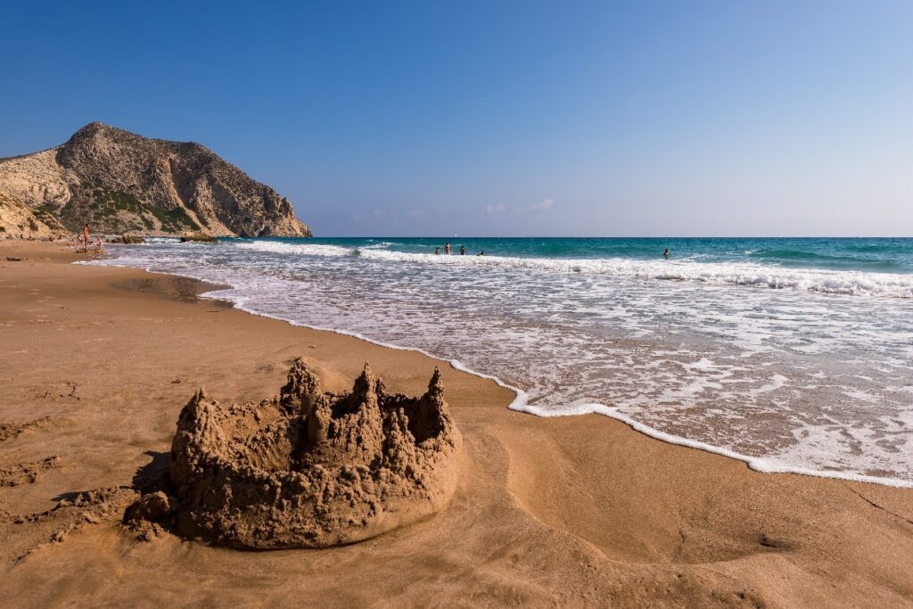 With its powdery sand and shallow turquoise waters, Paradise Beach lives up to its name. Located near Kefalos on the island’s southwest coast, it’s one of the most popular beaches in Kos. Ideal for swimming and sunbathing, it also features various water sports activities like jet-skiing and banana boating. Its gentle slope into the sea makes it family-friendly, while beach bars and loungers make it convenient for a full day in the sun.